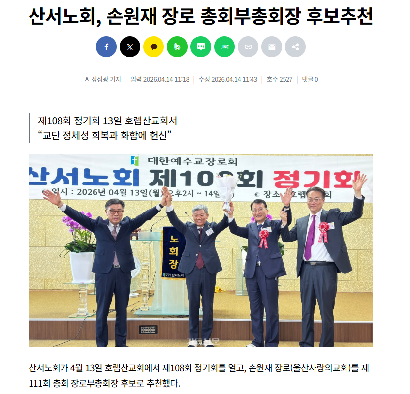 우리교회 손원재 장로님이대한예수교 장로회 111회 총회 장로부총회장 후보 추천이 되셨습니다.축하합니다.